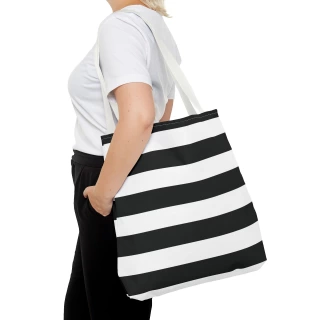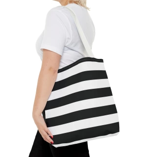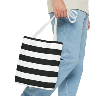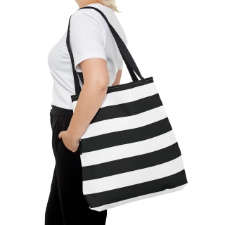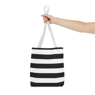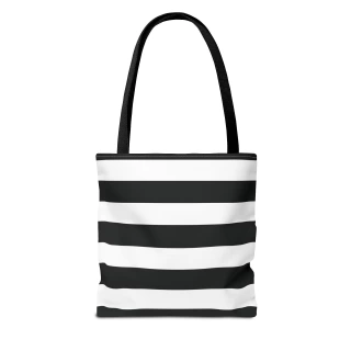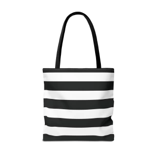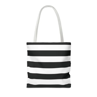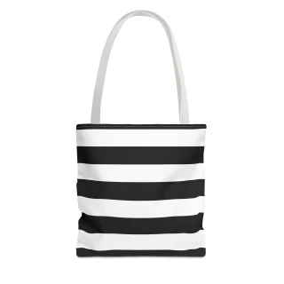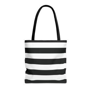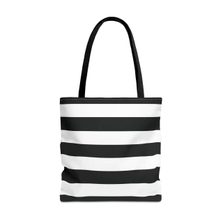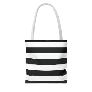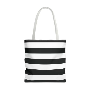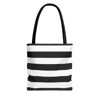 A stylish Black and White Striped Tote Bag perfect for everyday use. The design gives off a chic and classic vibe, making it ideal for fashion-forward individuals looking for a versatile accessory. This tote bag is relevant for holidays, everyday outings, shopping trips, and gift-giving occasions.